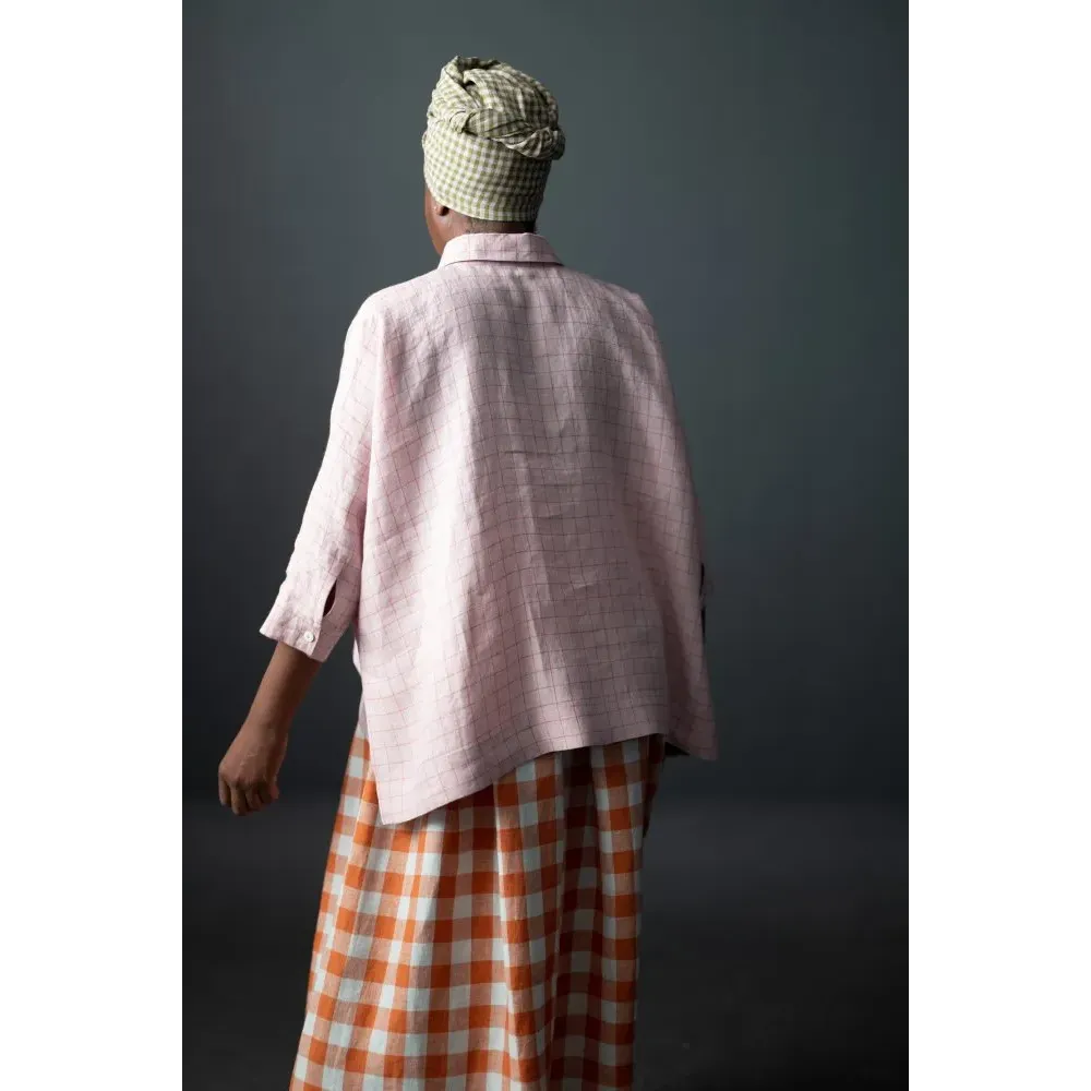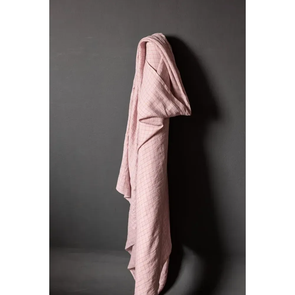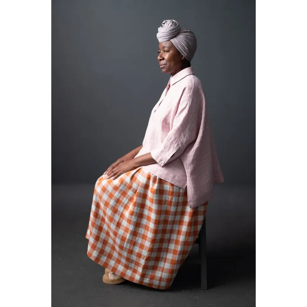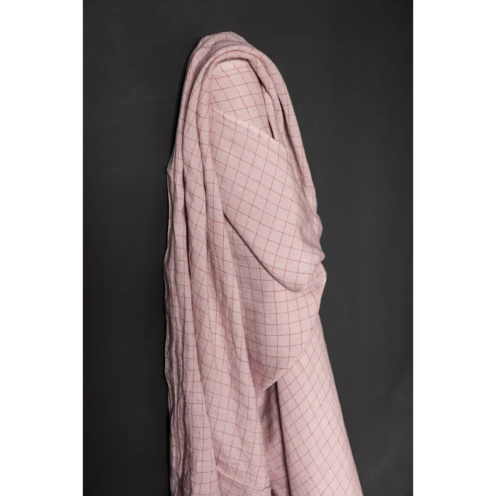 Stoffet har en dus rosa base med et oransje rutemønster (2,1 x 1,9 cm). Det egner seg godt til både klær og hjemmeinnredning.