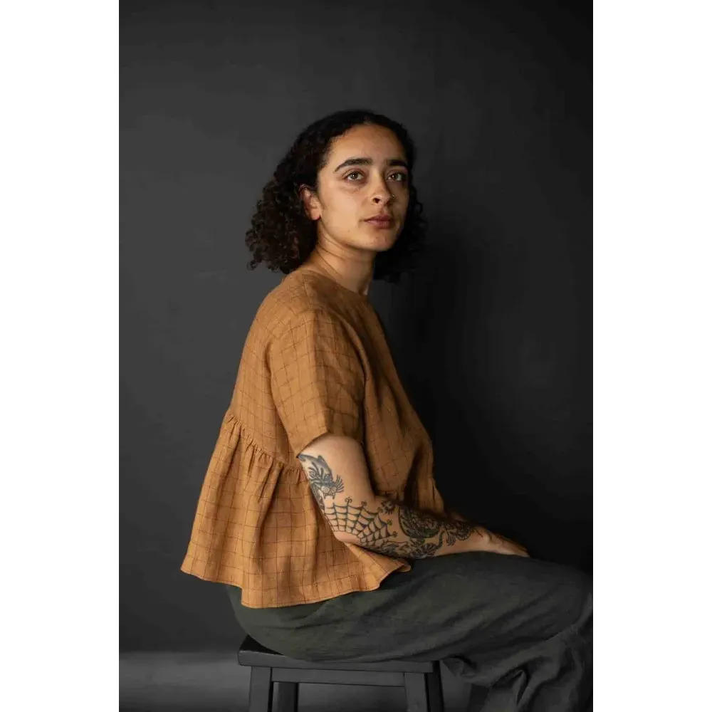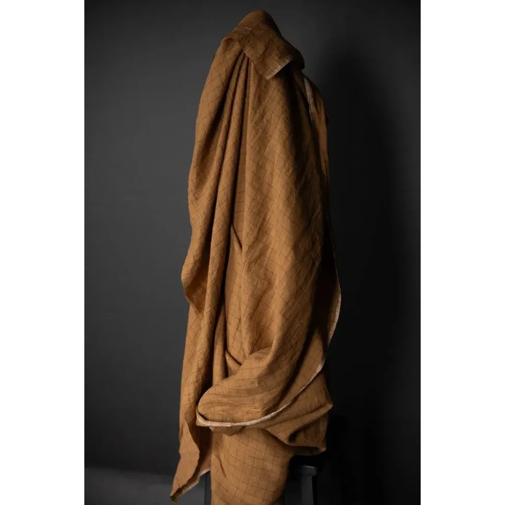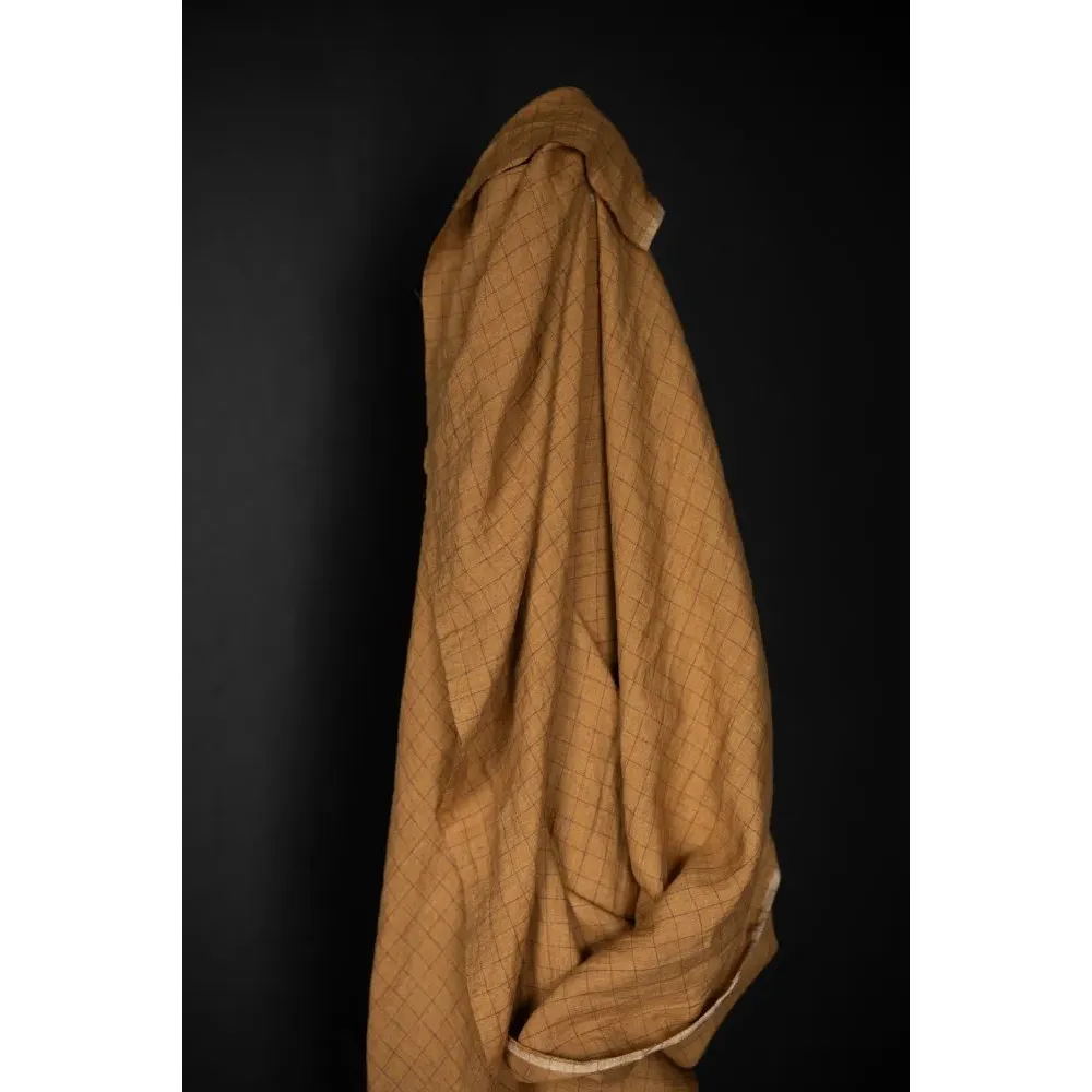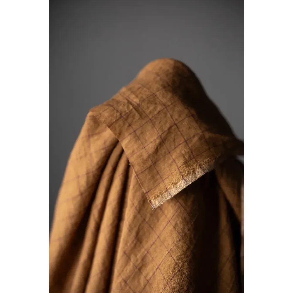 Stoffet har en aubergine farget rute på en cognac farget base og egner seg til både klær og hjemmeinnredning.