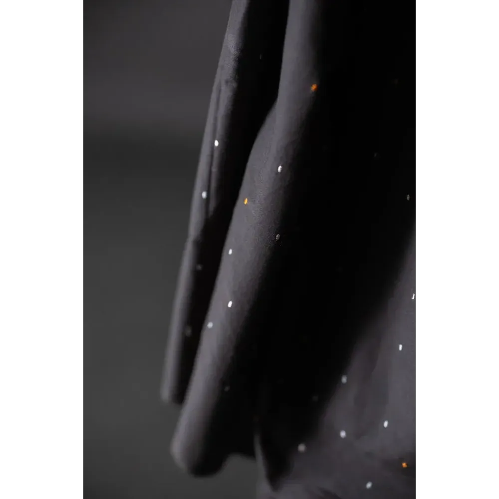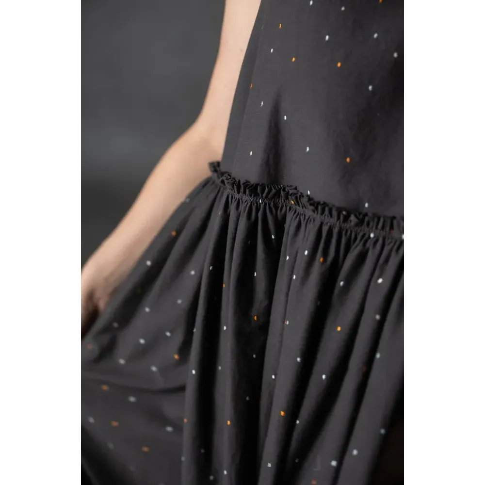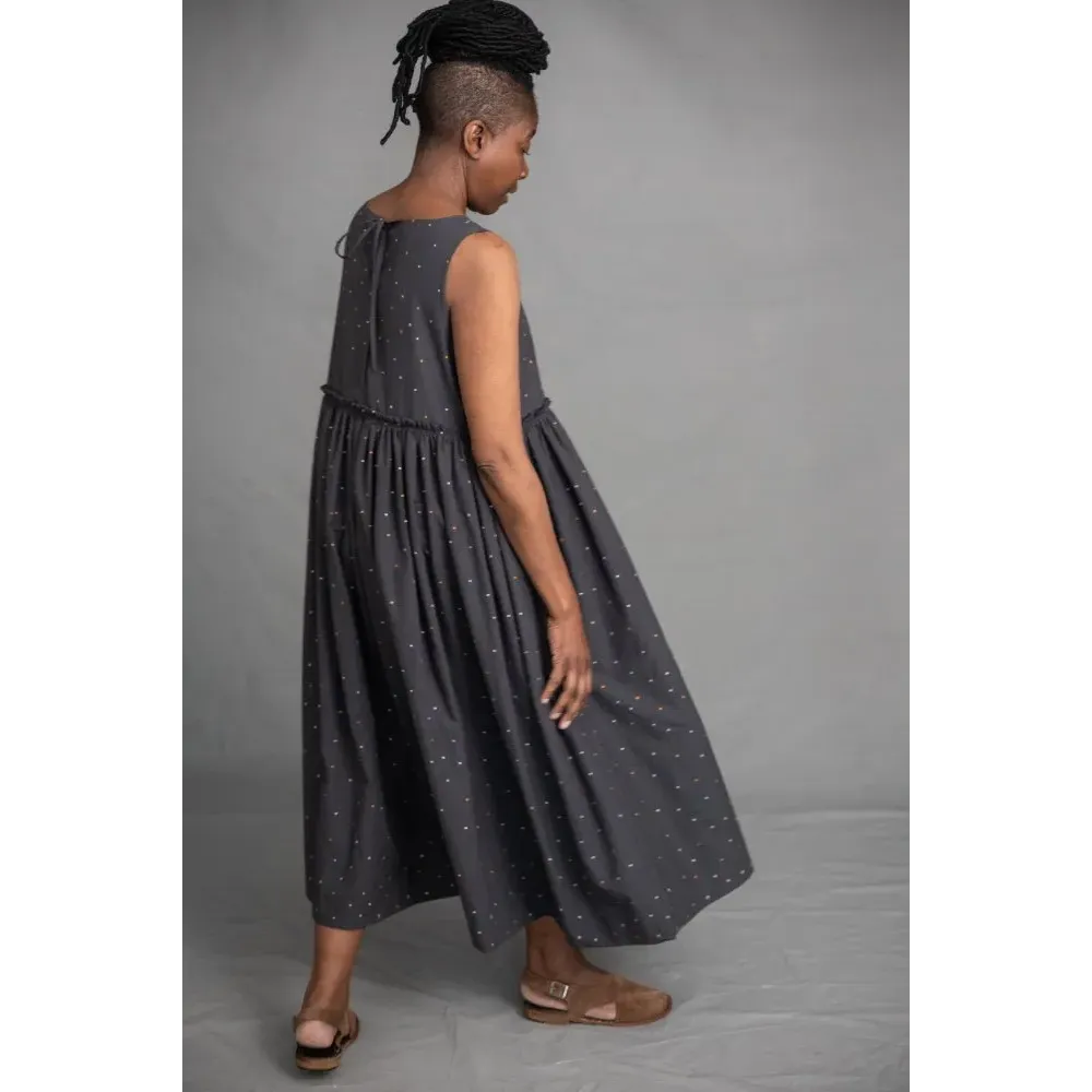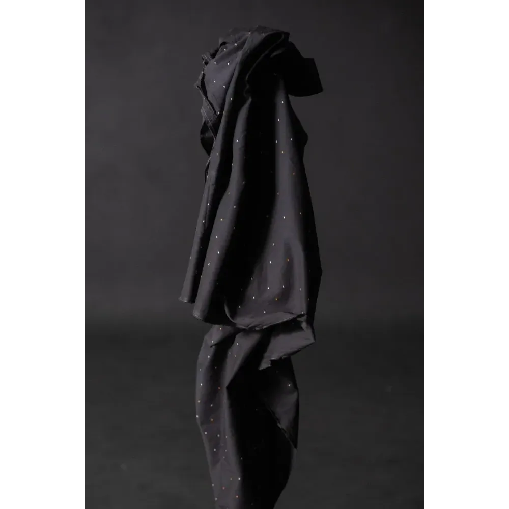 Libra Spot er et lett bomullstoff med mørk grå bunn og konfetti-lignende prikker i lilla, grå, blå og oransje. Denne bomullen egner seg godt til klær.